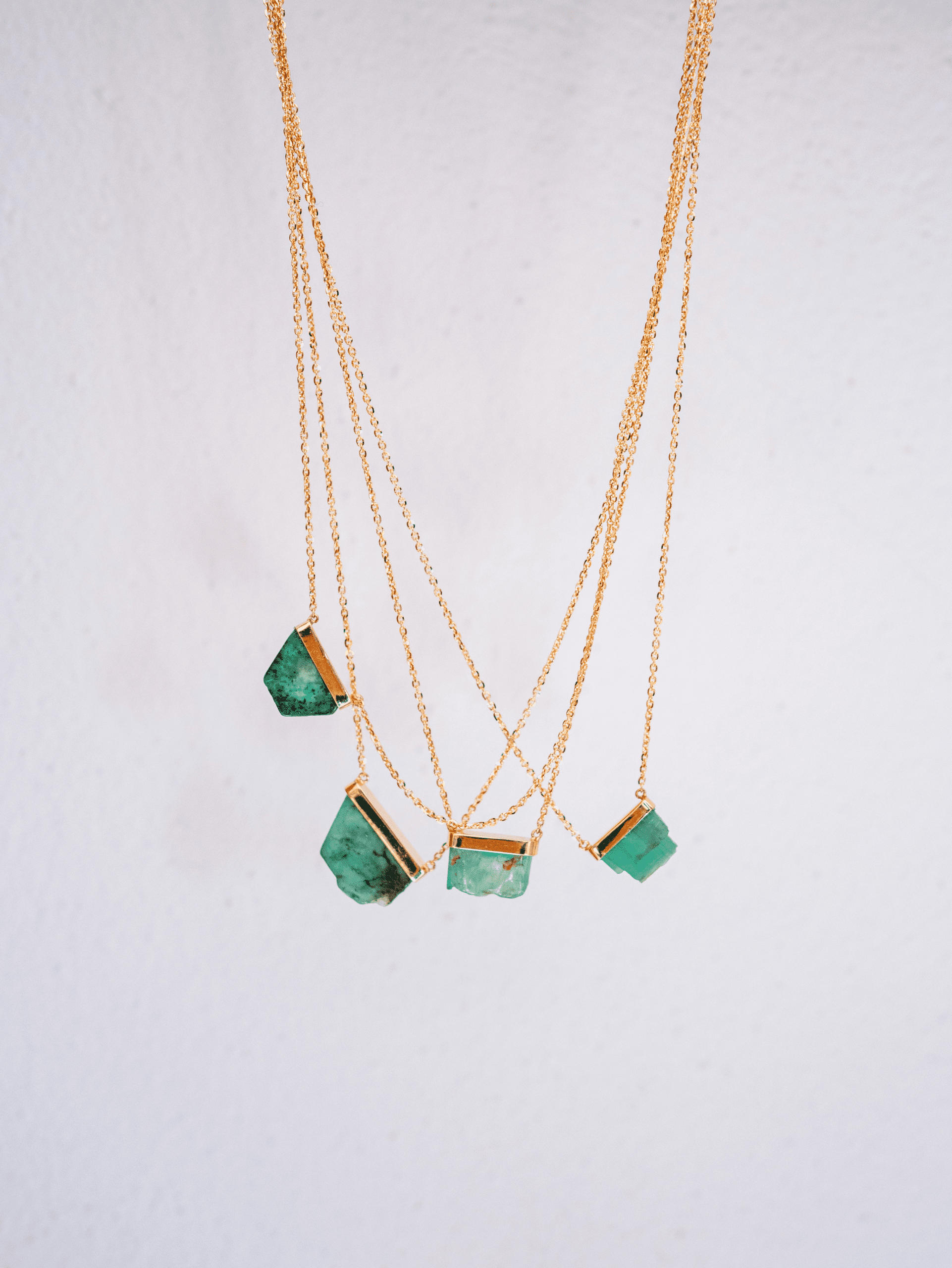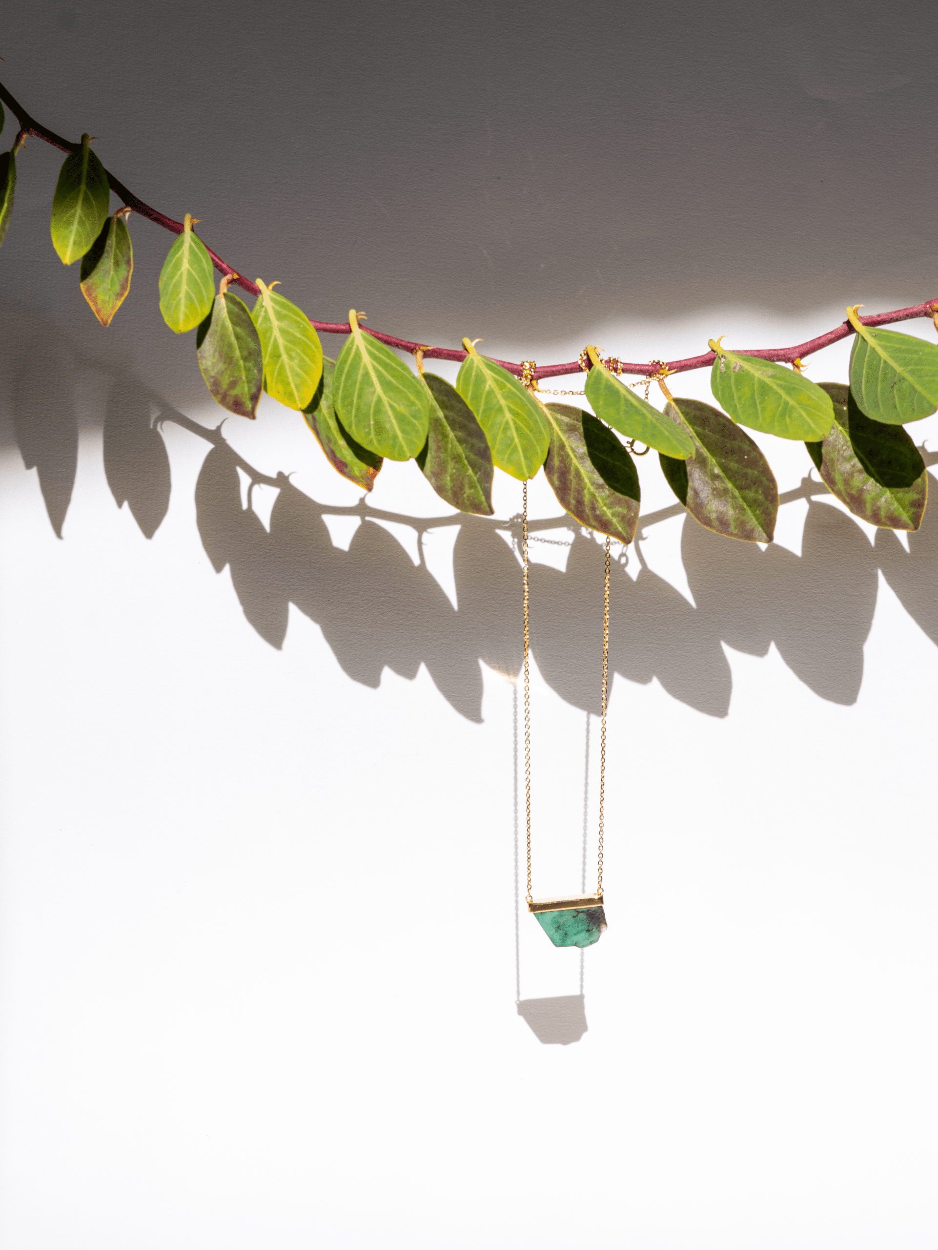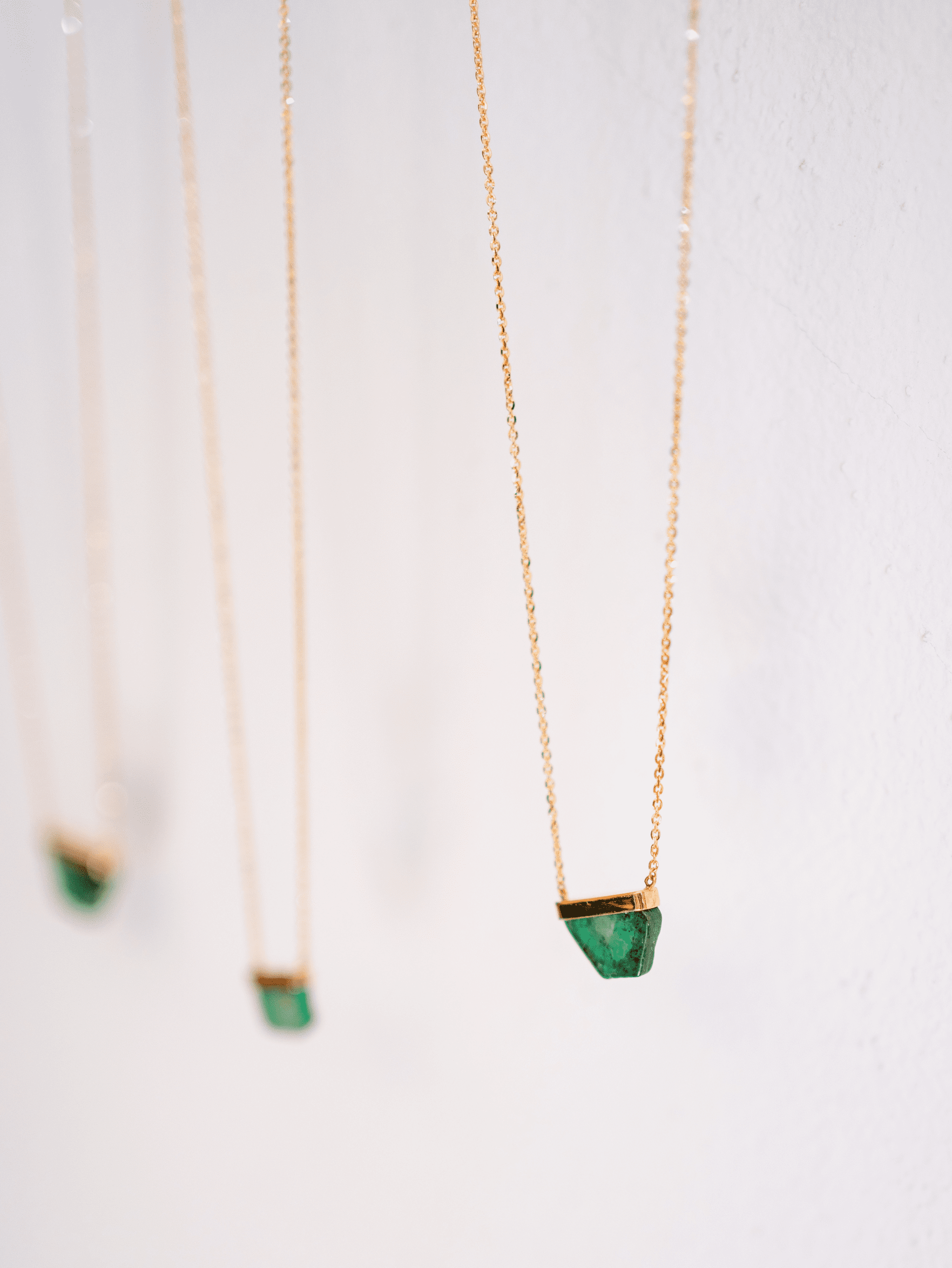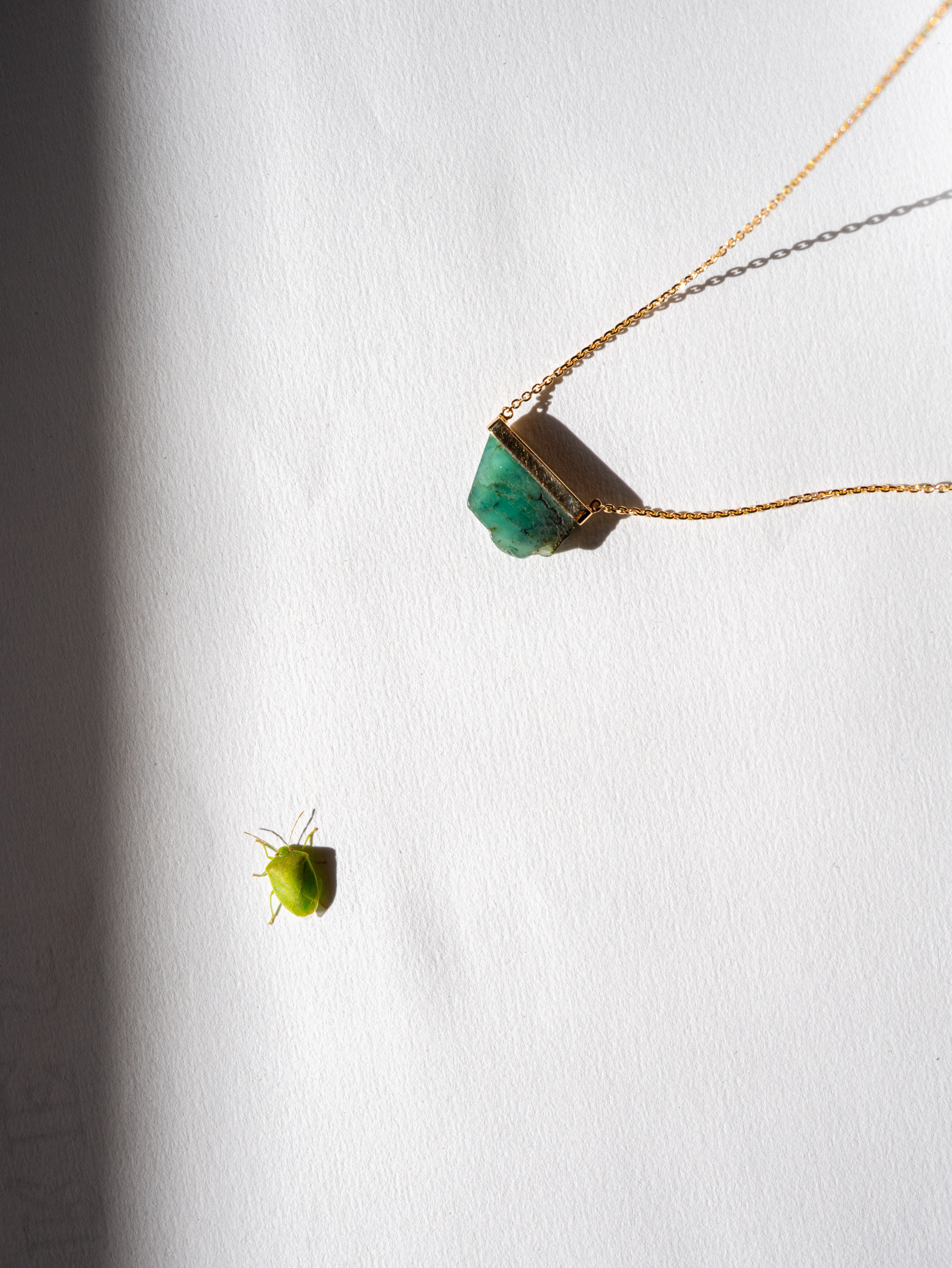 Collar realizado en oro amarillo de 18kt, con cadena de 45 cm y una lámina de esmeralda natural en bruto como protagonista.